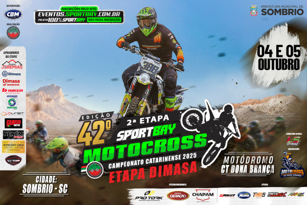 Sombrio (SC) será o palco da velocidade e da adrenalina neste sábado e domingo, dias 04 e 05 de outubro , com a realização da 2ª etapa do Sportbay Campeonato Catarinense de Motocross 2025 - Etapa Dimasa . O evento, que faz parte da 42ª edição do estadual, promete reunir os principais pilotos do sul do Brasil da modalidade no Motódromo CT Dona Branca , transformando a cidade em referência do motocross no sul catarinense.
